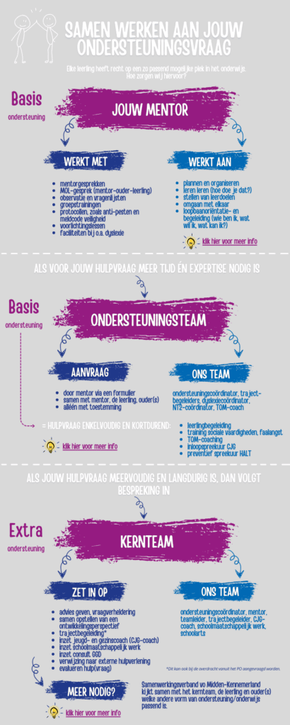 Het ondersteuningsaanbod is er om onze leerlingen hulp en begeleiding te bieden om zich zo goed mogelijk te ontwikkelen. Dit kan ondersteuning zijn bij schoolse taken, maar ook bij sociaal-emotionele en buitenschoolse hulpvragen. Deze visual laat onze werkwijze zien: wat wij aanbieden in de basis en welke extra ondersteuning mogelijk is. Een belangrijk onderdeel in de basisondersteuning is ons mentoraat. Wij werken in de onderbouw met een duomentoraat: elke klas heeft gedurende de tweejarige brugklas twee mentoren. Zo is er altijd aandacht voor individuele gesprekken en groepsdynamiek. In de brugklas heeft elke klas ook twee juniormentoren.